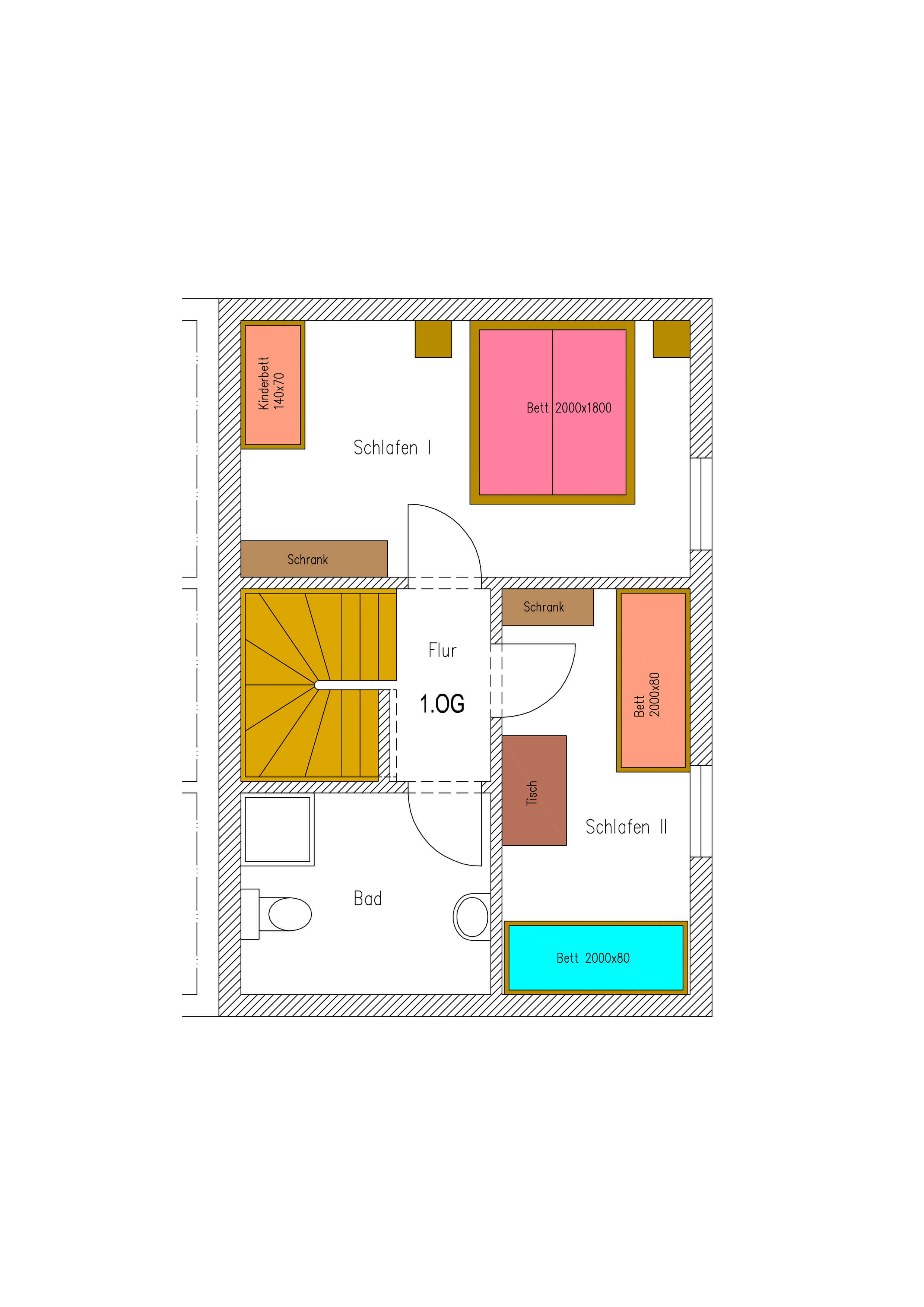 1. Schlafzimmer mit Doppelbett (160x200+30)+Kinderbett (60x120) 2. Schlafzimmer mit 2 Einzelbetten (80x200) |