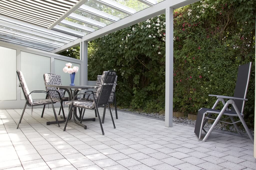 Im Außenbereich befindet sich die Terrasse mit Glas-Terrassendach, Gartenmöbeln und Elektrogrill. Für Schatten sorgt eine elektrisch bedienbare Markise. Auf der Rückseite des Hauses befindet sich eine sichtgeschützte sonnige Liegewiese mit zwei Gartenliegen sowie ein abschließbares Gartenhaus. Ebenfalls zum Ferienhaus gehört ein kostenfreier Pkw-Stellplatz.