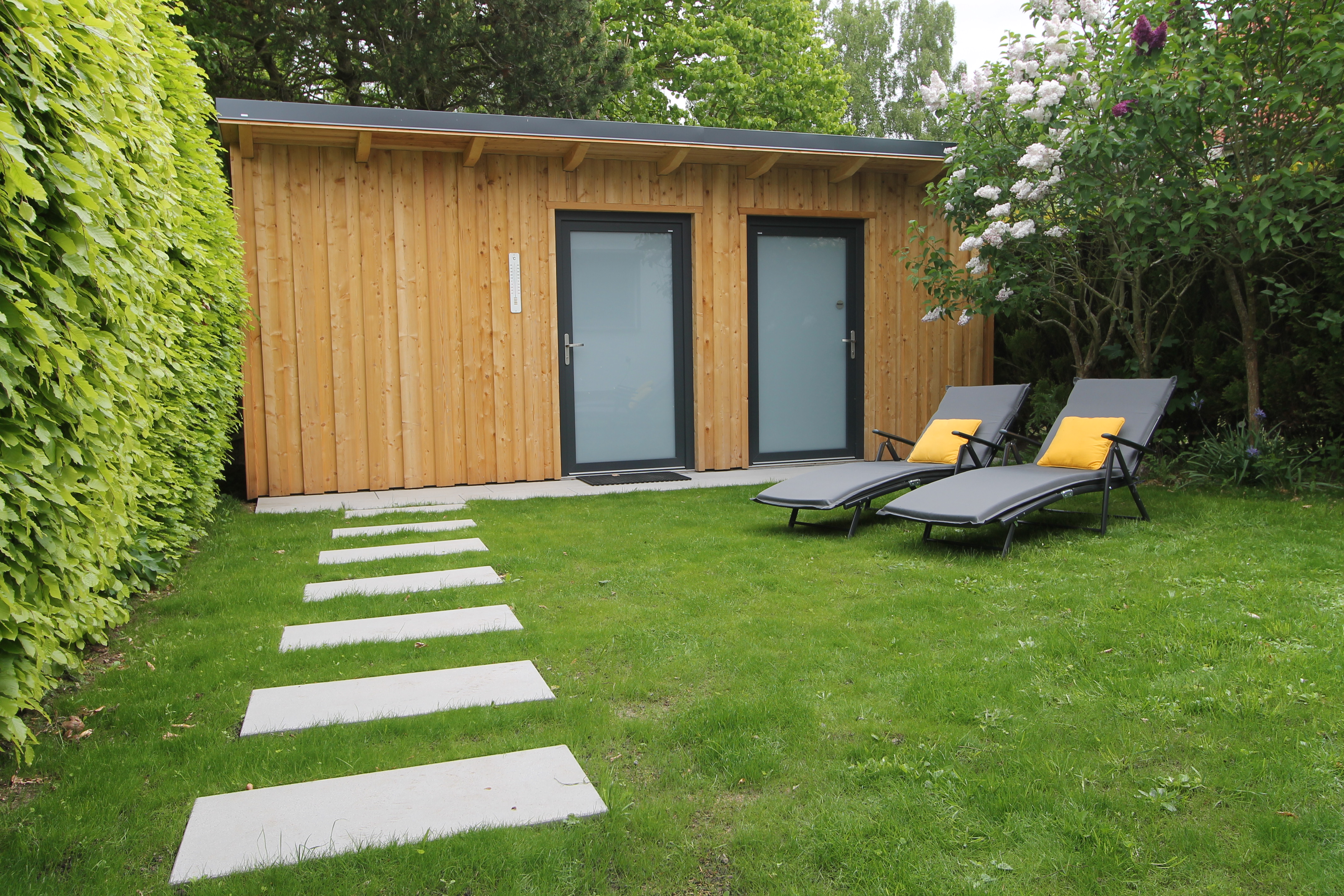 Terrasse mit Glas-Terrassendach und el. Markise, sichtgeschützte Liegewiese mit zwei Gartenliegen, Elektrogrill |
