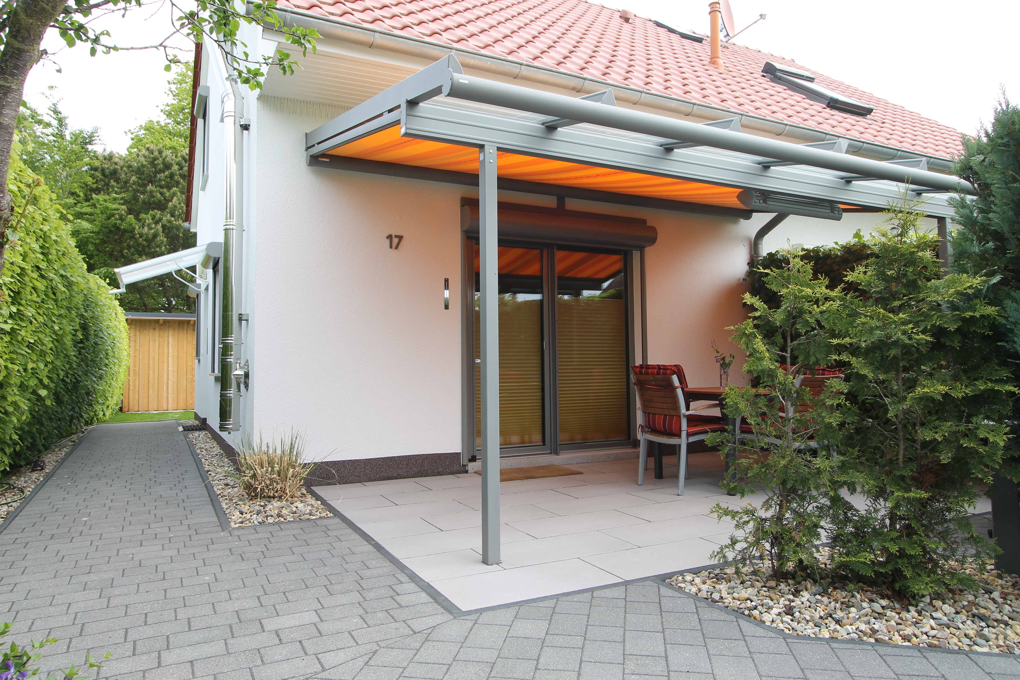 Terrasse mit Glas-Terrassendach und el. Markise, Terrassenmöbel, Liegestuhl, Elektrogrill |