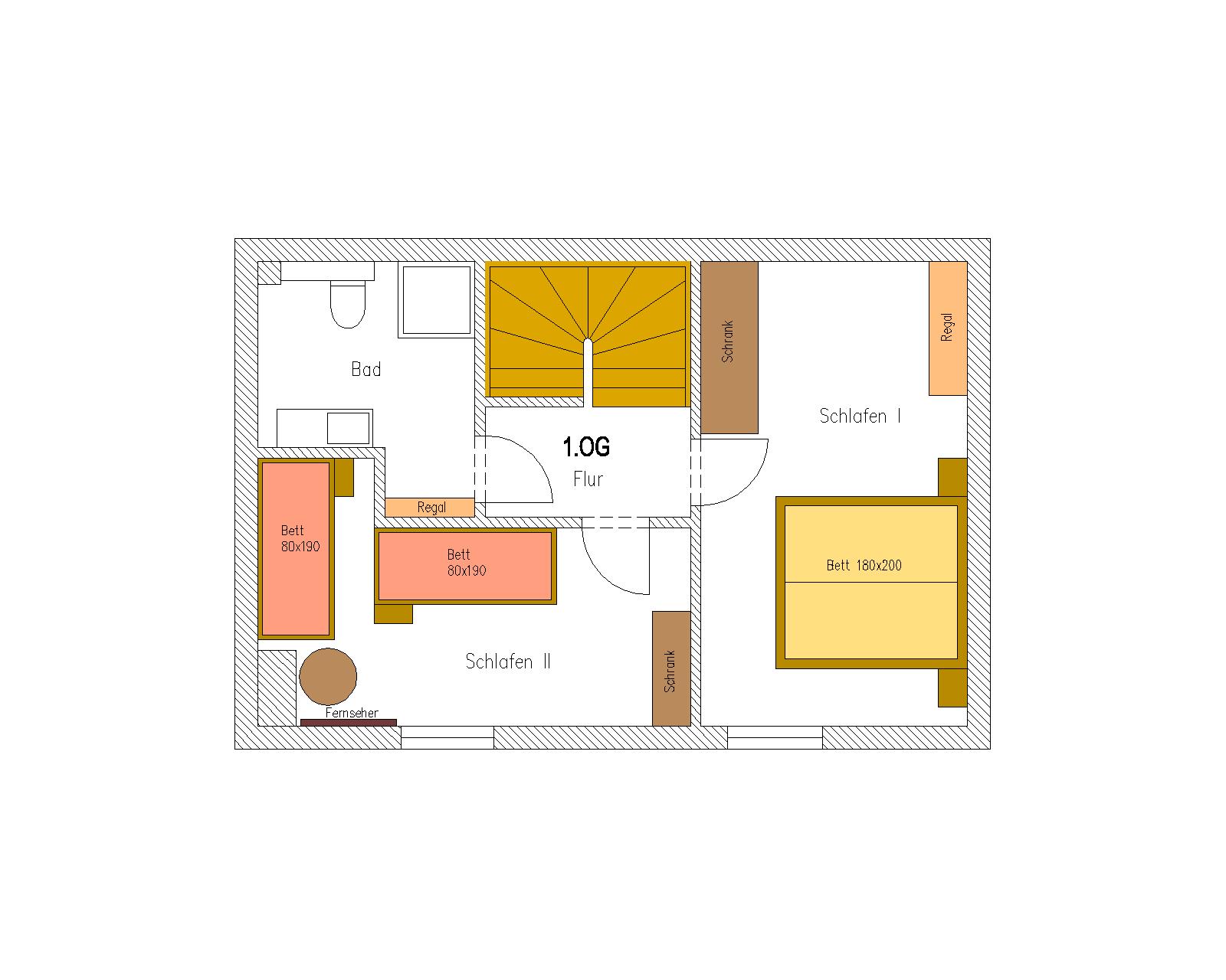 Im Obergeschoss liegen zwei Schlafzimmer: im ersten Schlafzimmer befindet sich ein Doppelbett, das zweite ist zwei Einzelbetten ausgestattet. Ebenfalls im Obergeschoss finden sie das Badezimmer mit Dusche und WC.